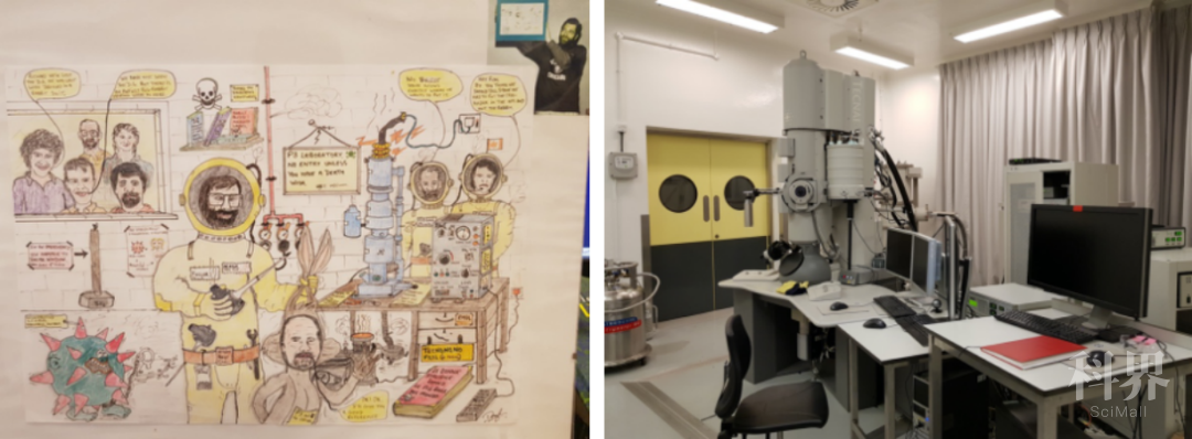 图12.(左)牛津大学粒子成像中心创始人之一Stephen Fuller教授及其团队的自画像;(右)该中心BSL-3级冷冻电镜实验室内景。(来源:李赛)
