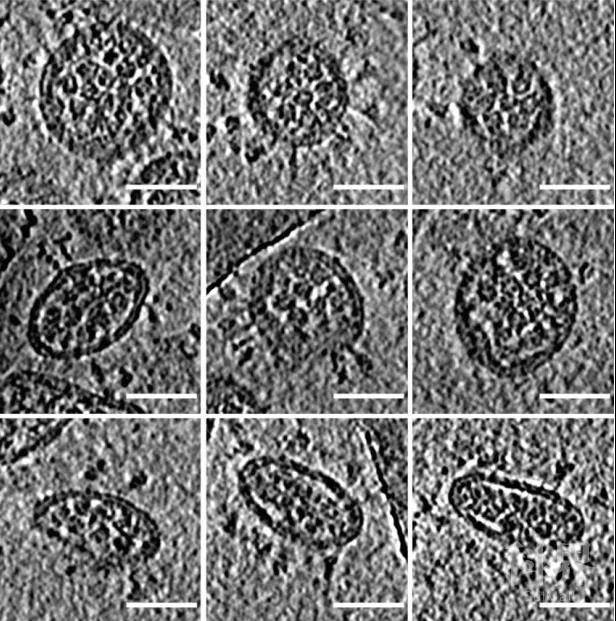 图11. 新冠病毒体内有很多珠子一样的物质,而且它们隐约有排列规律。标尺为50纳米(图:李赛)