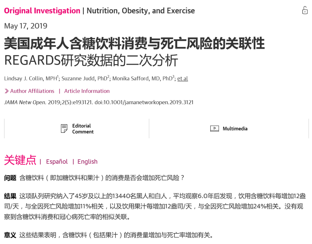 举例来说,2019年5月17日,JAMA Network Open发表过一个关于含糖饮料的公卫研究,同时分析了100%果汁和可乐等含糖饮料对心血管疾病死亡率和全因死亡率的影响,发现少喝点没关系,但是喝太多的话(从饮料中获得的热量超过了日摄入总热量的10%),果汁并不比可乐更健康,可乐也并不比果汁更糟糕呢[1]。