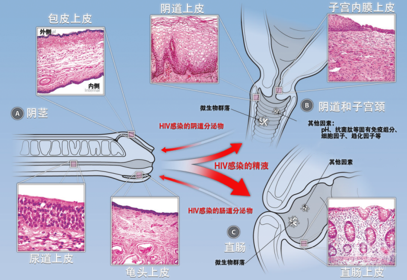 在不同的插入式性交过程中,携带HIV病毒的精液或射精前分泌物可能感染阴道黏膜或直肠黏膜,而含有病毒的阴道分泌物或直肠液也可以感染阴茎龟头或包皮的上皮(图3)。