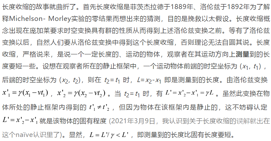 从这个关于狭义相对论长度收缩效应的认识过程笔者得到的教训是,作为学习者要习惯怀疑,要找到对具体学问细节负责的那个人,要到大的知识体系中推导验证所学内容。此外,作为作者,写书时一定要主动提醒读者去怀疑。