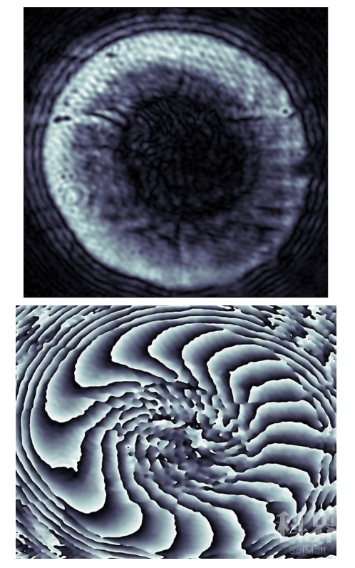 旋转的电磁极化子流体可以用来模拟旋转的黑洞。左侧图片显示不同区域的流体密度,中间黑暗区域的边缘就像是黑洞的事件视界。右侧的流体相位图显示了它的涡流。| Maxime Jacquet
