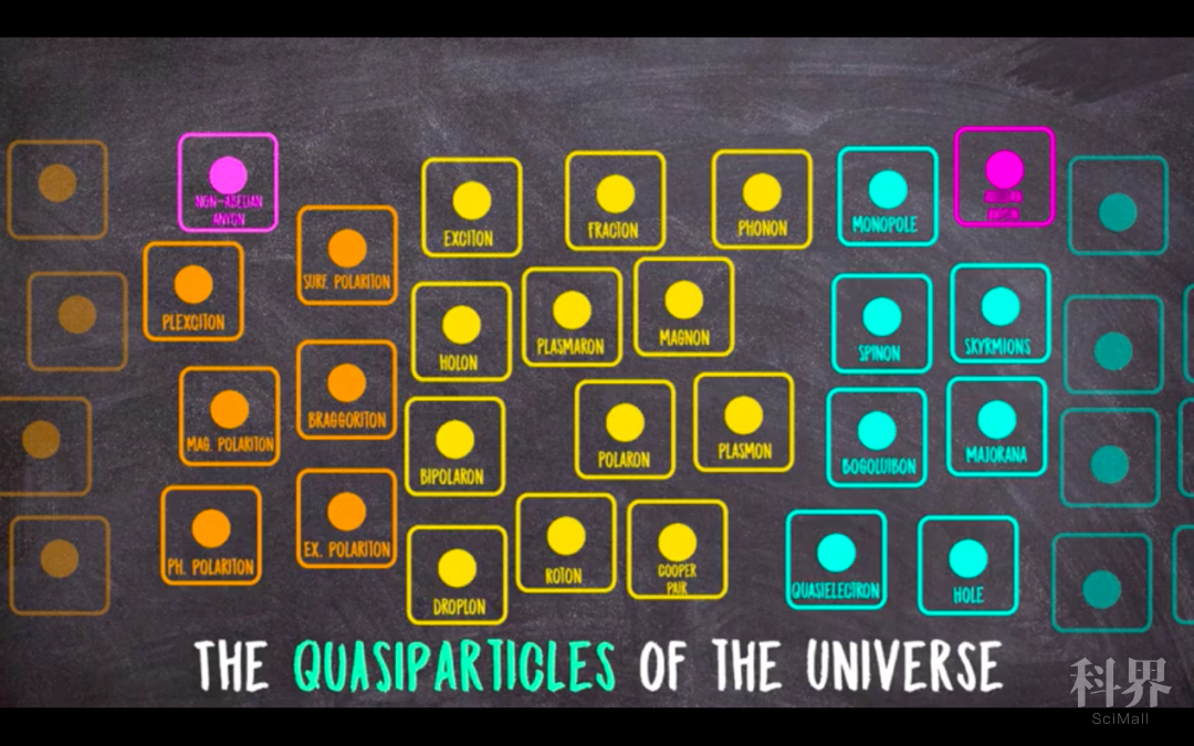 在凝聚态物理中,还有其他更为奇特的准粒子。例如,所有的基本粒子可以根据其自旋特性分为两种类型:一种是半整数自旋的费米子,比如电子,另一种是整数自旋的玻色子,比如光子。但一种叫做任意子(anyon)的准粒子却可以超越这个限制,它们既不同于费米子,也不同于玻色子。(相关介绍参见《在微型粒子对撞机中寻找任意子+文小刚答疑 | 众妙之门》)