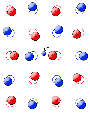 再比如,朗道在1933年提出一种叫作极化子(polaron)的准粒子。当电子在固体材料中运动时,会吸引周围的正电荷而排斥负电荷,导致原子偏离原来的平衡位置,以有效地屏蔽电子,这使得电子表现得更像是一个具有更大有效质量的准粒子,也就是极化子。