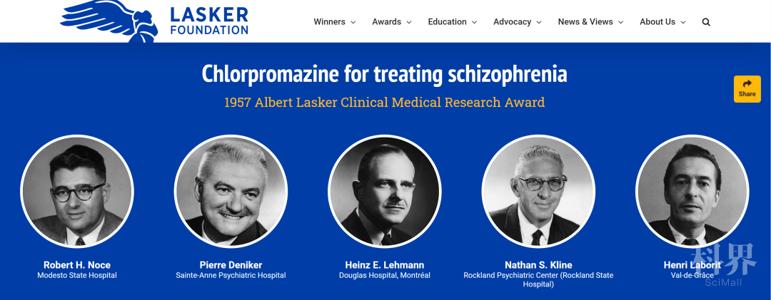 图4. 1957年,拉斯克临床医学奖授予5位医生,表彰他们对氯丙嗪、利血平用于治疗精神分裂等特定精神疾病的研究。(点击看大图)