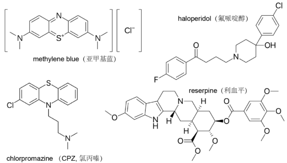 图2. 最早的三个抗精神疾病药物氯丙嗪、利血平、氟哌啶醇的化学结构。其中,氯丙嗪和氟哌啶醇是从亚甲基蓝的结构基础合成而来。