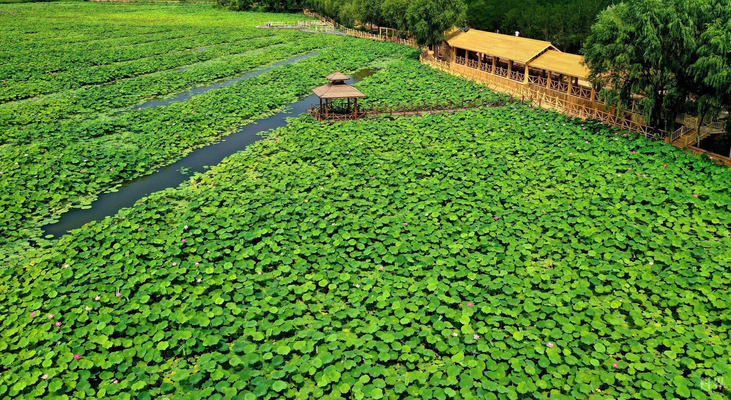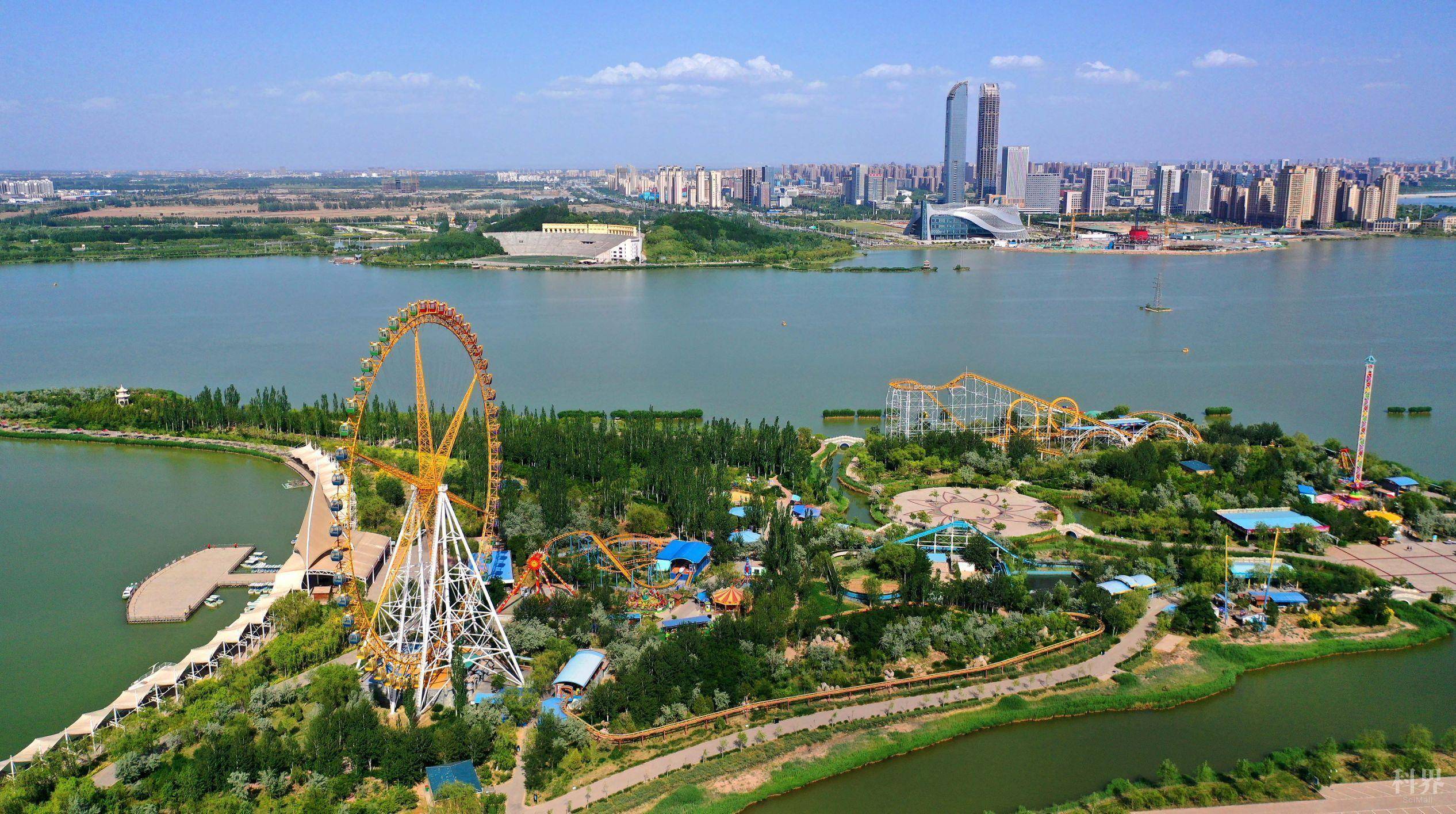 盛夏时节,银川市水光潋滟,天空湛蓝,林木青葱茂盛;贺兰山青衣裹翠,远近景致相得益彰,仿若一幅山水画卷。