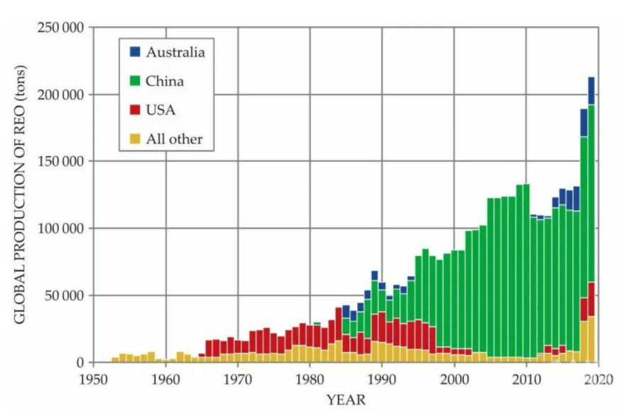 历年世界各国稀土氧化物产量,中国稀土的市场占有率近年来被明显蚕食