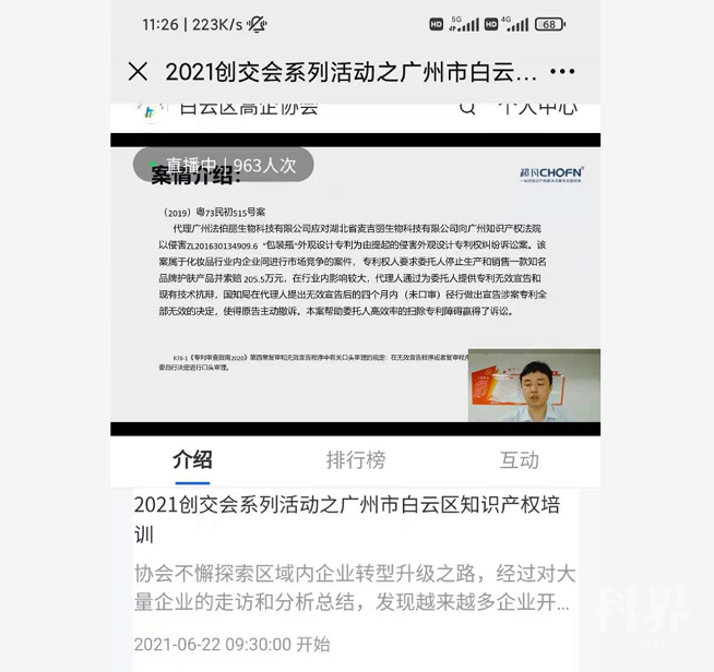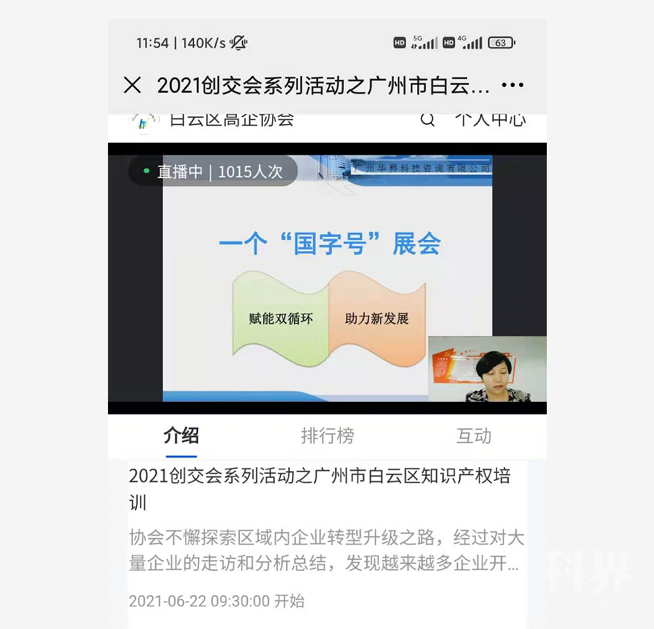 为扎实推进创交会成果转化基地建设,解决企业网络平台维权等问题,6月22日,由中国科协企业创新服务中心、广州市科协指导,创交会办公室主办,广州市白云区高新技术企业协会、广州华昇科技咨询有限公司承办的2021创交会系列之广州白云区知识产权培训活动成功举行,约有1000多名企业人员参加线上活动。