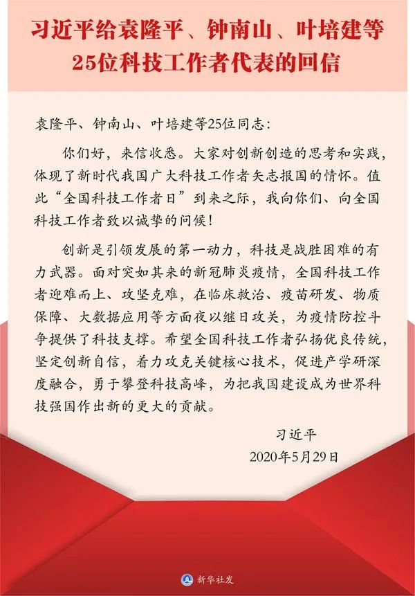 2020年5月,在第四个“全国科技工作者日”到来之际,习近平给袁隆平、钟南山、叶培建等25位科技工作者代表回信,向他们并向全国科技工作者致以诚挚的问候。