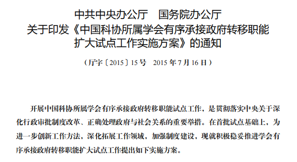 同年7月,《中国科协所属学会有序承接政府转移职能扩大试点工作实施方案》印发。