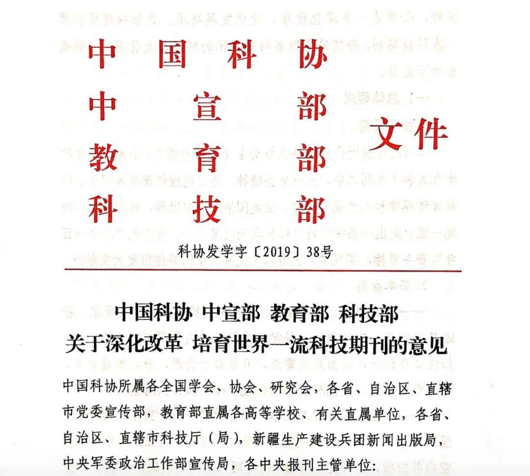 2019年8月,中国科协、中宣部、教育部、科技部联合印发《关于深化改革培育世界一流科技期刊的意见》,启动“中国科技期刊卓越行动计划”。
