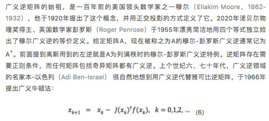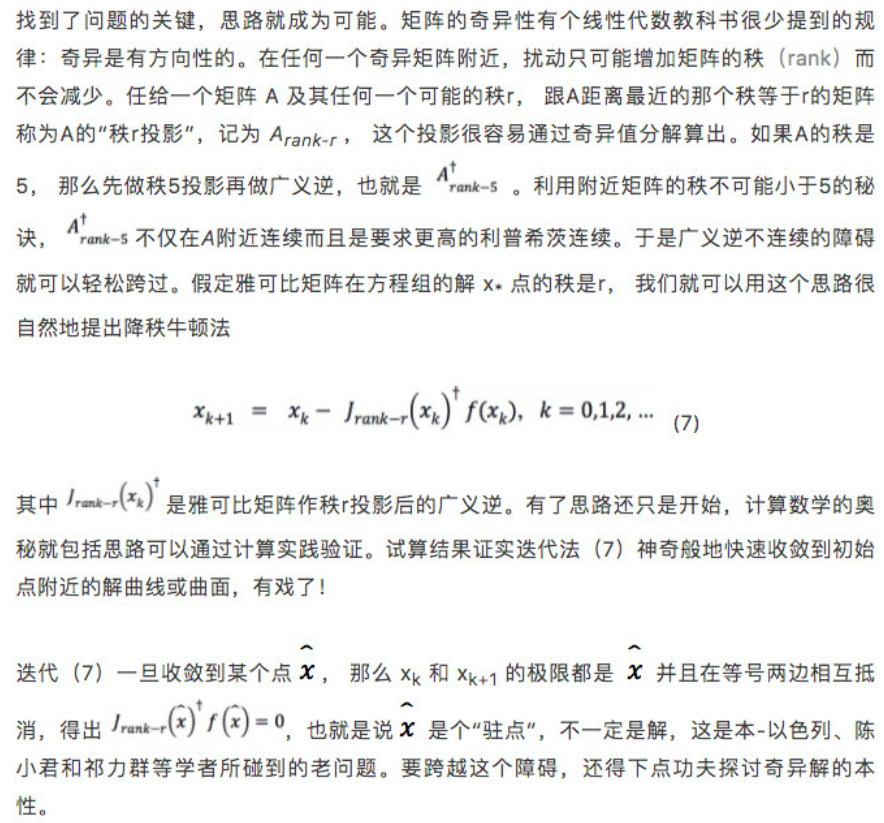 并试图应用于求解奇异方程组。可是问题并不是把求逆上标“-1”换成求广义逆上标“†”这么简单。它需要一大串莫名其妙的条件才能保证收敛,因此难以成为通用算法。