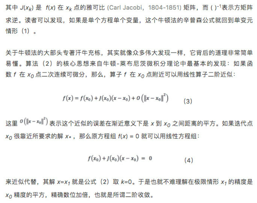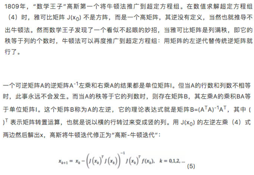 包括很多专家在内都有一个流传广泛的误解,以为一个方程组的方程个数必须跟变量个数一样多。这个误解恐怕来自教科书,因为计算数学教科书基本上只谈这类方程组。只有专家读的专著才会谈到,方程个数大于变量个数的方程组称为超定方程组,反之称为欠定方程组。事实上,正方形的方程组虽然有很多理论和求解的方便,但是很多问题本质上就是超定或欠定方程组,在科学计算中根本不可回避。对于超定或欠定非线性方程组,相应的线性近似方程组(4)也是超定或欠定,雅可比矩阵的逆矩阵别说去计算,连定义都没有。怎么办呢?十分遗憾,通用教科书里基本上是找不到答案的。