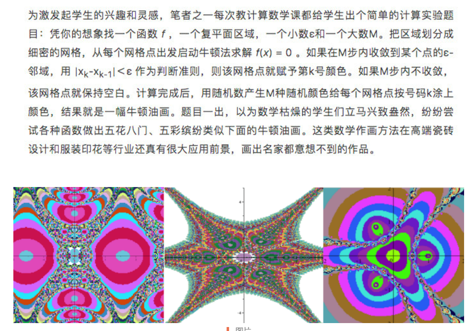 常有人说数学是艺术,意思多半是说数学本身是艺术,看你有没有能力欣赏。读者可能想不到,牛顿法的局部收敛特性还可以用来创作似乎毫不相干的艺术作品。无论是什么世界名画,油画在数学上无非是每个点都有一个颜色,而每个颜色都可以换算成三个数字代表红黄蓝三原色的强度,反之亦然。任何数学方法,只要能给每个点赋予一个或三个数字,这个方法就可以用电脑做出一幅油画,只要发挥想象力创造力,创作可能性是无穷的。