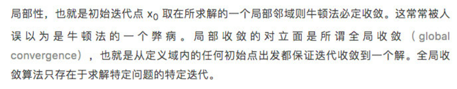 比如说,巴比伦算法在求平方根这个特定问题上就是全局收敛。在发现全局收敛的通用迭代法之前,牛顿法的局部收敛性在一般问题上不输任何算法,所以很难说局部收敛是牛顿法的弊病和短板。局部收敛更恰当的说法是牛顿法的一个特性。由于一般方程组 f(x) = 0 的解可以不唯一,即使找到全局收敛算法,从常理上说这个潜在算法也应该具有局部收敛性,否则无论如何靠近一个解都会跳到另一个解,这算法真能用吗?