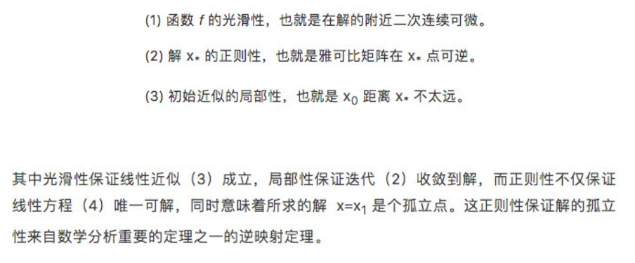 从这个基本思想出发,我们也很容易看出牛顿法适用的三个条件: