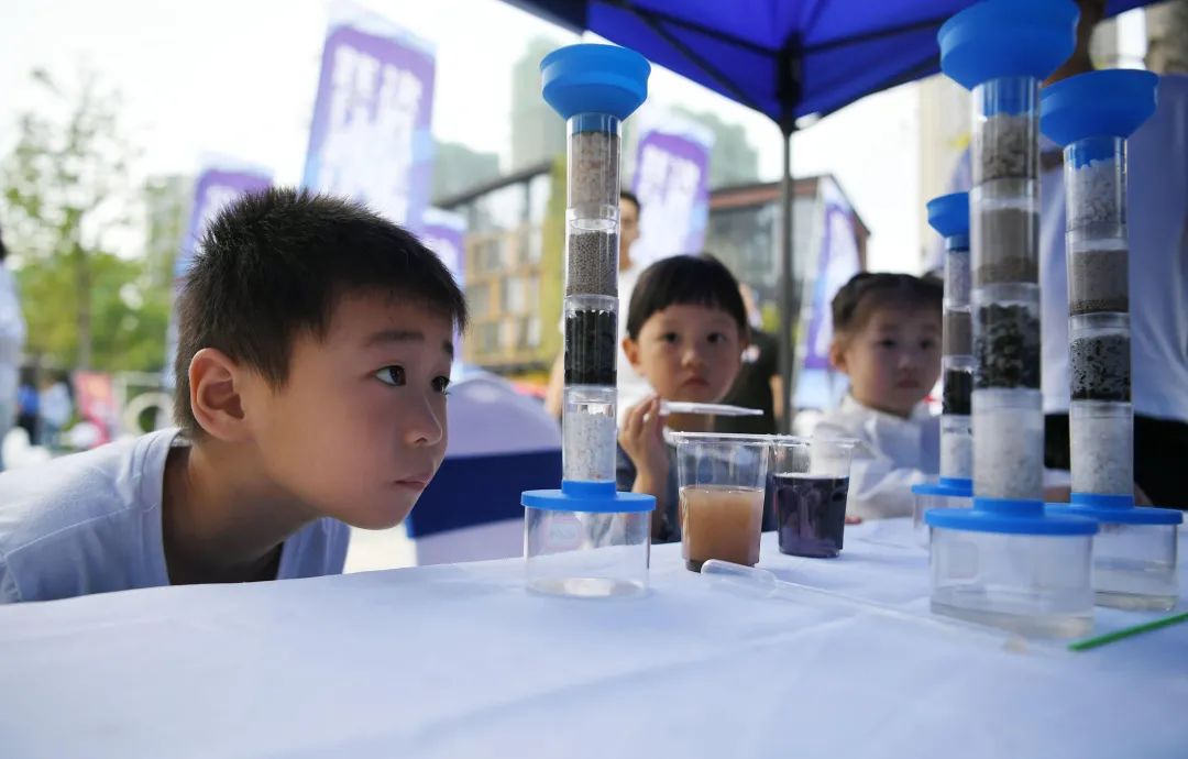 2020年9月19日至25日,以“决胜全面小康,践行科技为民”为主题的全国科普日活动在各地开展。图为在安徽省合肥市开展的科普日活动中,小朋友正在进行污水分离小实验。图源:视觉中国