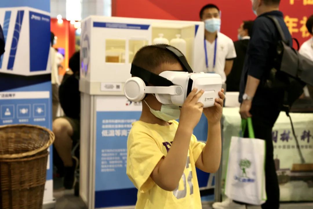 2021年5月22日至28日,以“百年回望:中国共产党领导科技发展”为主题的全国科技周,吸引了大量观众。图为小朋友在体验VR技术。图源:科普时报