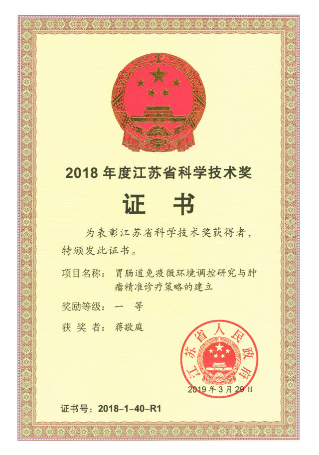 他带领团队的科技成果《胃肠道免疫微环境调控研究与肿瘤精准诊疗策略的建立》荣获江苏省科学技术奖一等奖,取得了常州市卫生健康系统在江苏省科学技术奖上的历史性突破。凭借多篇目、高影响因子的学术论文,他入选2020年肿瘤学领域中国高被引学者“全球前2%顶尖科学家”榜单。