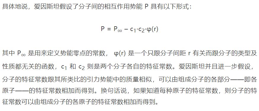 具体地说,爱因斯坦假设了分子间的相互作用势能 P 具有以下形式: