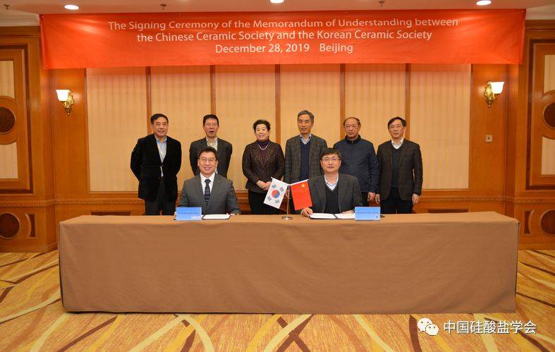 2019年12月28日,中国硅酸盐学会与韩国陶瓷学会在北京举行国际交流合作谅解备忘录交换仪式。在中国硅酸盐学会理事长高瑞平、副理事长南策文、晋占平、宋力昕、常务理事潘伟、李敬锋的见证下,中国硅酸盐学会秘书长谭抚和韩国陶瓷学会代表权度均教授交换了由双方理事长签署的谅解备忘录。