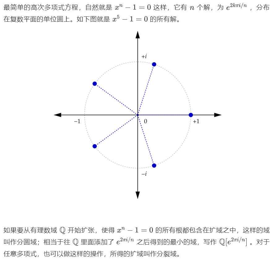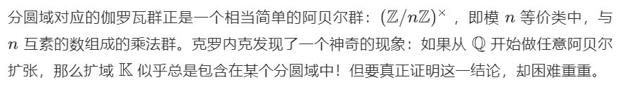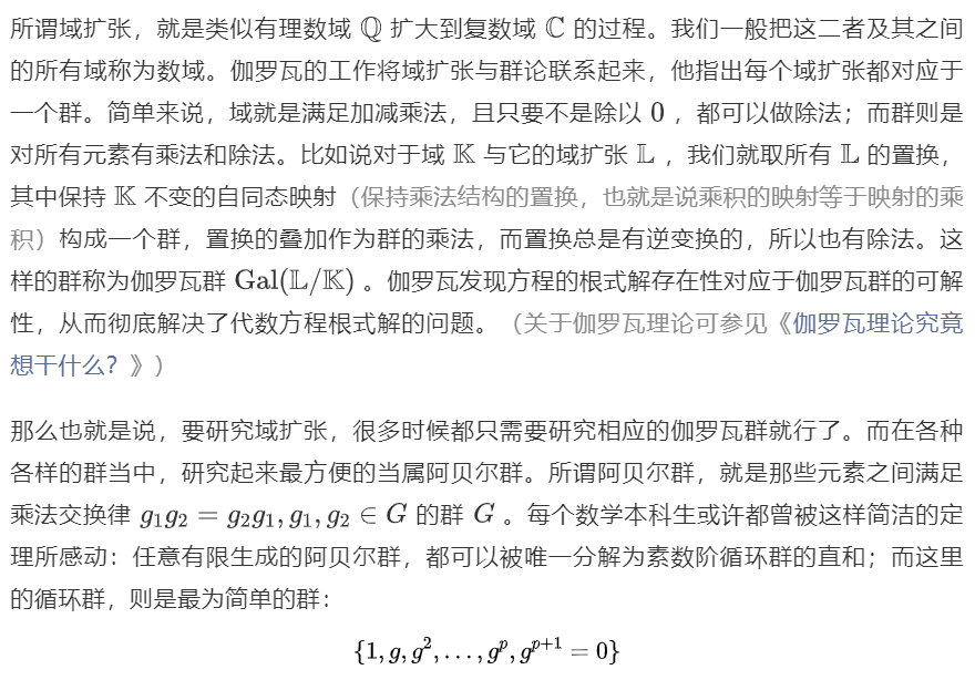 即使是没有受过数学训练,对群论知之甚少的读者,也可以大概这样理解:我们对于阿贝尔群基本上知根知底。那么要是能将阿贝尔群的知识运用于相应的域扩张,即阿贝尔扩张,那想必会带来更多美妙的结果。