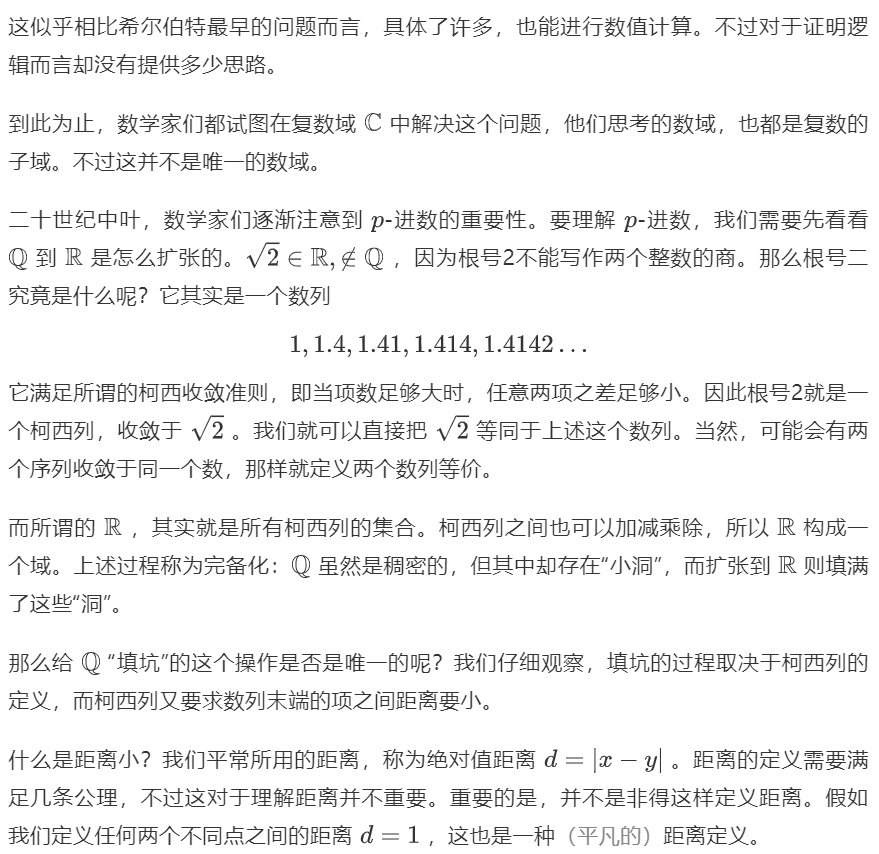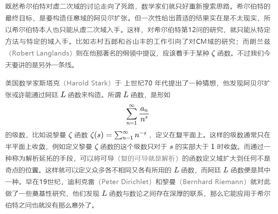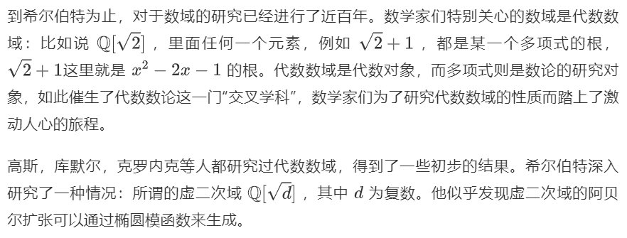 但是希尔伯特并没有止步于此。克罗内克思考的问题仅仅是有理数域 的扩张,那对于别的数域呢?这一问题即是希尔伯特23个问题中第12个问题的原型。