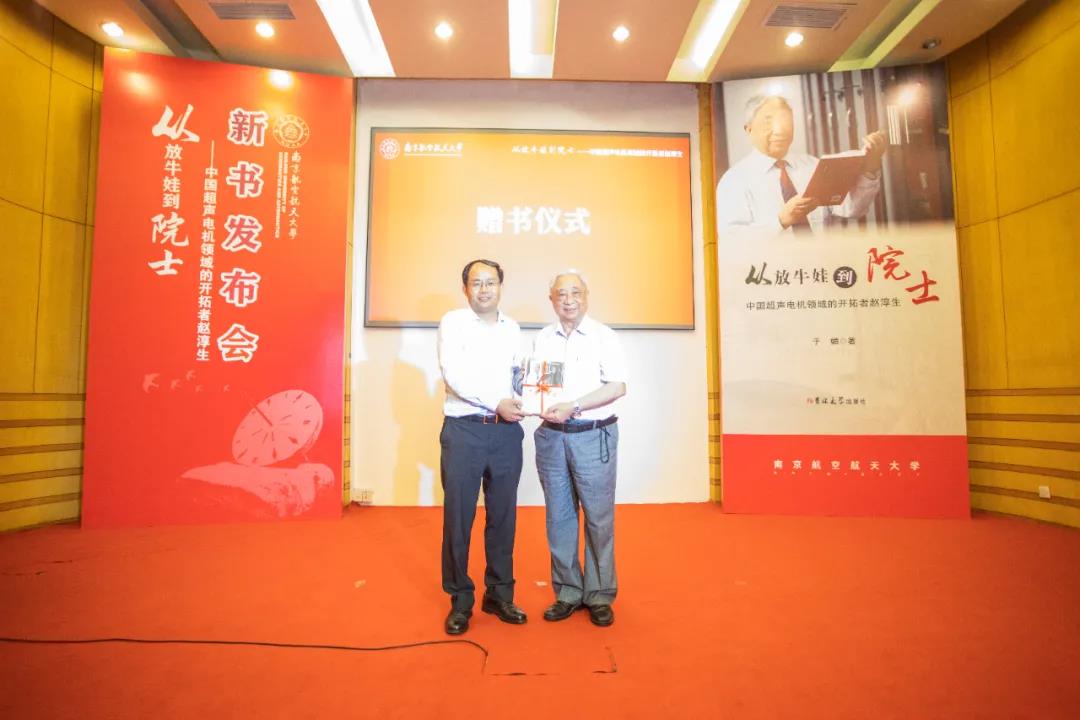 7月7日,南京航空航天大学“院士思政公开课”前,《从放牛娃到院士——中国超声电机领域的开拓者赵淳生》新书发布,中国工程院院士、南京航空航天大学校长单忠德代表学校接受赠书。唐宇明摄