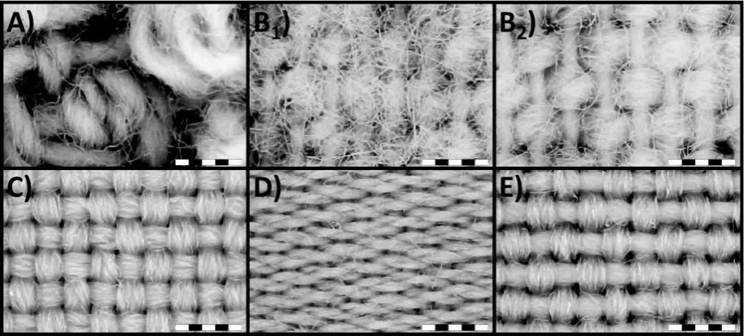 显微镜下几种防护效果最好的布料放大图像:A. 100%棉,毛巾,B1和B2分别是100%棉,轻质法兰绒的外表面和内表面,C. 100%涤纶,成衣面料,D.100%棉,枕套,E.100% 涤纶短纤丨来源:ACS Nano 2020, 14, 7, 9188-9200