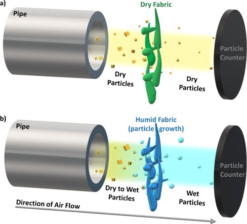 干湿材料对比之下,棉布口罩的过滤和防护效果模拟图。可见通过干燥织物(a图)的气溶胶颗粒要多于通过潮湿织物(b图)的颗粒丨来源:Hydration of Hydrophilic Cloth Face Masks Enhances the Filtration of Nanoparticles