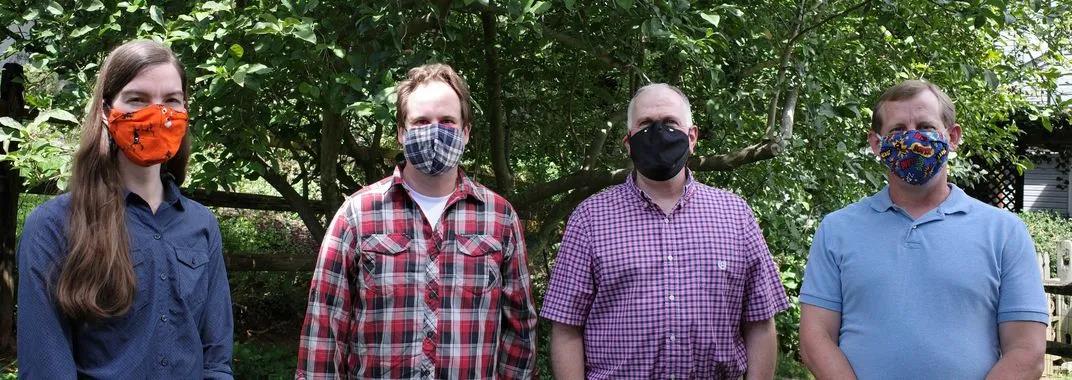 图上四位佩戴DIY口罩的科学家最先在期刊上发表了口罩材料研究,从左到右分别是:Jamie Weaver, James Radney, Edward Vicenzi和Christopher Zangmeister丨来源:NIST