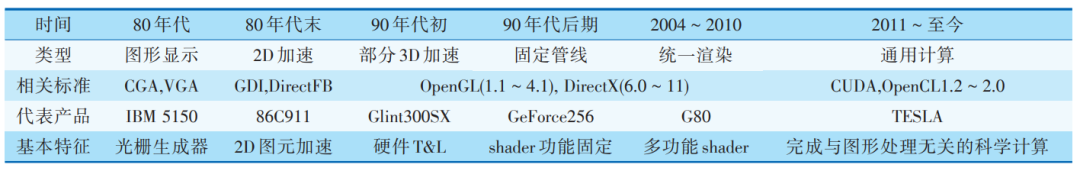 1994年,3DLabs发布的Glint300SX是第一颗用于PC的3D图形加速芯片,它支持高氏着色、深度缓冲、抗锯齿、Alpha混合等特性,开启了显卡的3D加速时代,然而这个阶段的显卡大多没有执行统一的标准,加速功能也不尽相同,直到NVIDIA推出GeForce256,它整合了硬件变换和光照(transform and lighting,T&L)、立方环境材质贴图和顶点混合、纹理压缩和凹凸映射贴图、双重纹理四像素256位渲染引擎等,并且兼容DirectX和OpenGL[4],被称为世 界上第一款GPU。硬件T&L的引入,极大减轻了CPU的负担,是这一时代GPU的标志。2001年微软发布DirectX 8,提出了渲染单元模式(shader model) 的概念,根据操作对象的不同引入了2种shader,分别是顶点着色器(vertex shader)和像素着色器(pixel shader),从此,硬件T&L被抛弃,进入 shader时代,此时的GPU架构是固定管线[5]。