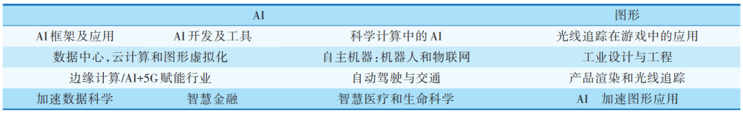GPU的未来方向,可以从NVIDIA 2019年的中国GTC(GPU technology conference)大会窥见一斑。GTC会议是NVIDIA近年来每年举办的一场GPU技术大会,汇集全球顶级的GPU专家,提供GPU领域颇具热门话题的相关培训和演讲。在这个大会上展示的是全球GPU研究人员的最新的研究和应用方向,通过GTC会议可以窥见GPU的未来。2019年中国GTC大会设置了两大主题,分别是AI和图形,两个大主题之下各自又有一些小主题[8],如表2所示。