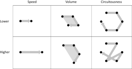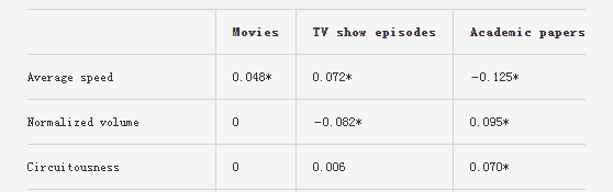 该研究将电影、电视剧和学术论文的文本分为长度相近的段落,然后使用词向量,将其映射到高维语义空间,每个段落看成高维空间中的一个点,点的位置代表这一段的主题。之后审查不同段落之间的路径。从中得出第一个指标是行文的速度,即在同一段落间、词汇之间的跳跃是否剧烈,词与词之间的变化是否迅速。
