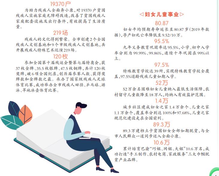 妇女平均预期寿命延长至80.87岁(2019年数据),九年义务教育巩固率达95.5%,小学、初中入学率分别为99.99%、99.86%,连续十年巩固在99%以上;