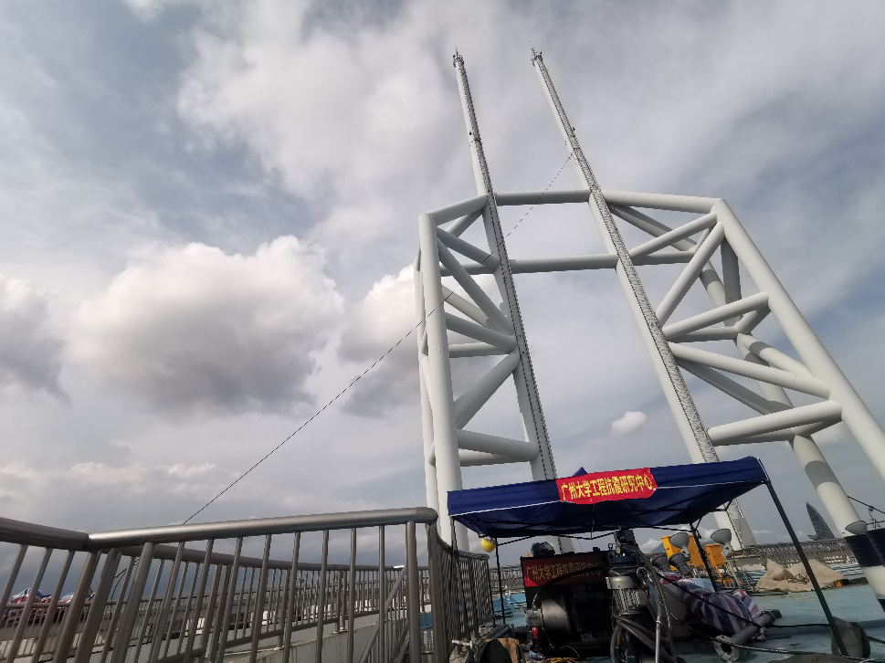 在论证分析过程中,广州大学工程抗震研究中心科研团队紧急承担了大厦桅杆及主体结构的人工激振、动力性能分析及钢管混凝土脱粘等关键任务。于2021年5月25日至6月30日间,在科研团队带头人周福霖院士的带领下,在学校领导的支持下,团队秉持艰苦奋战的作风,废寝忘食地讨论工作方案、分析结果,克服了防疫、运输、吊装、施工等现场工作的重重困难,研制开发了赛格广场大厦人工激振测试系统,提出了两种测试方法,成功实施了对赛格广场大厦的系列激振试验、测试和分析工作,并采用超声相控阵测试技术实施了钢管混凝土脱粘检测。
