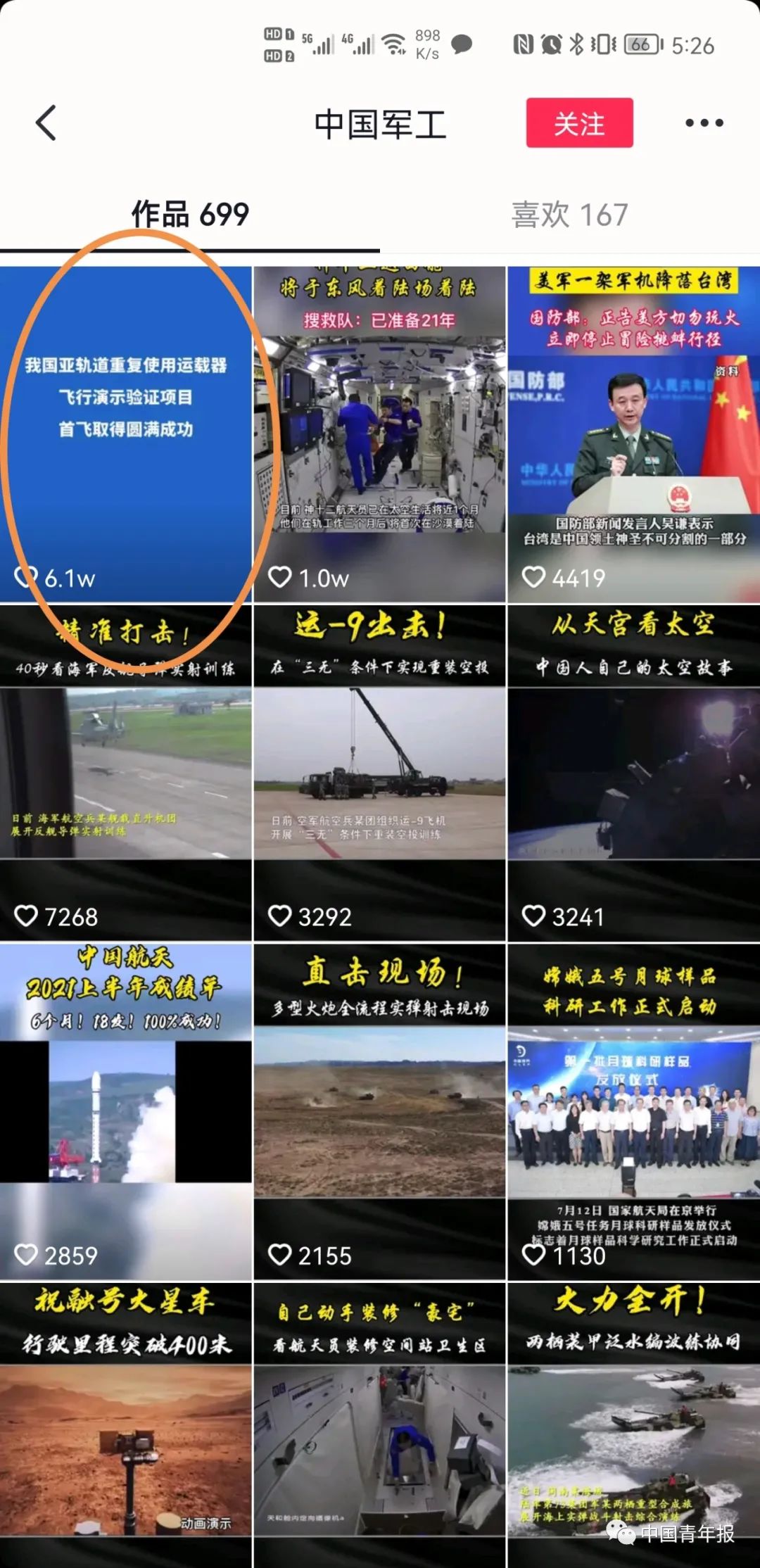 针对这则新闻信息,国家国防科技工业局新闻宣传中心抖音号“中国军工”发布了相关视频,引发数万点赞。不过视频内容只有3行文字和背景音,没有展示具体画面。