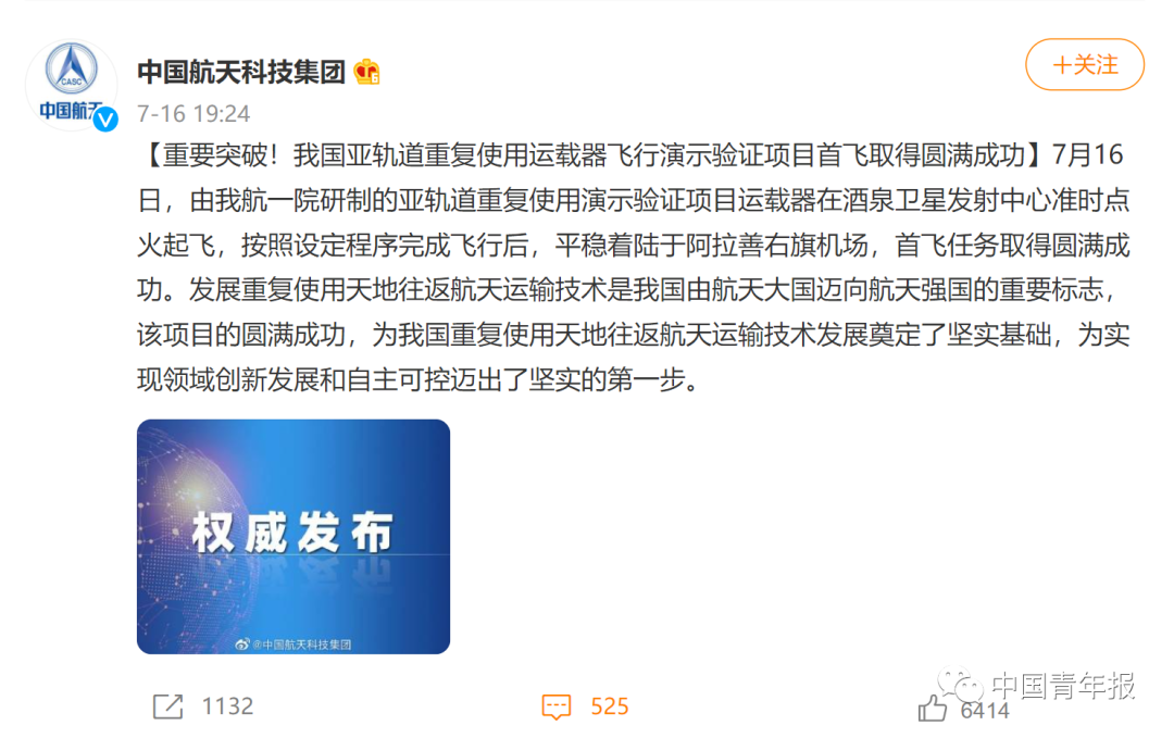 7月16日,振奋人心的消息传来:我国亚轨道重复使用运载器飞行演示验证项目首飞取得圆满成功。