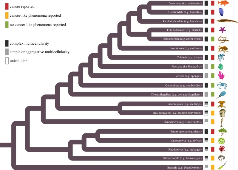 我们发现在多细胞生命的每个分支上都有癌症和癌症样现象(分化失调和过度增殖)的报道。丨图源:参考文献[5]