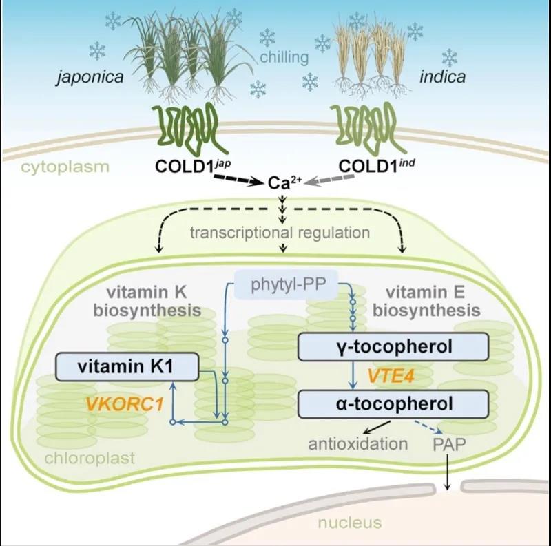 种康院士团队继发现水稻低温感受器COLD1之后,致力于解析其下游调控途径。他们通过多组学分析发现维生素E-维生素K1亚网络为COLD1下游通路,是决定籼粳稻低温耐受性差异的核心调控点。