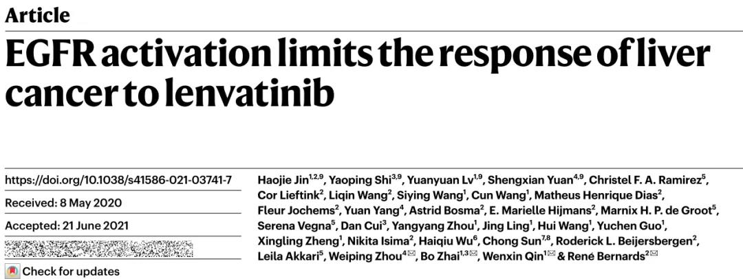 [1] Jin H, Shi Y, Lv Y, Yuan S, Ramirez CF, Lieftink C, Wang L, Wang S, Wang C, Dias MH, Jochems F, Yang Y, Bosma A, Hijmans EM, Groot MH, Vegna S, Cui D, Zhou Y, Ling J, Wang H, Guo Y, Zheng X, Isima N, Wu H, Sun C, Beijersbergen RL, Akkari L, Zhou W, Zhai B, Qin W, Bernards R.EGFR activation limits response of liver cancer to lenvatinib. Nature. 2021Jul 21, Online ahead of print.