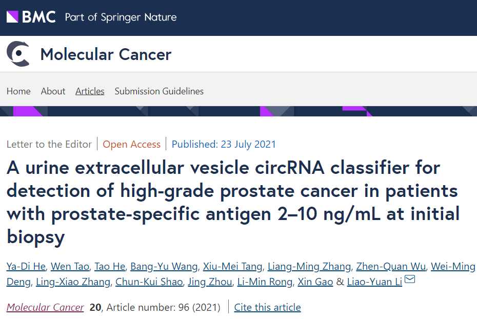 2021年7月23日,中山大学李辽源团队在Molecular Cancer(IF=27.40)在线发表题为的“A urine extracellular vesicle circRNA classifier for detection of high-grade prostate cancer in patients with prostate-specific antigen 2–10 ng/mL at initial biopsy”的研究论文,该研究的目的是确定一种尿液细胞外囊泡环状 RNA (circRNA) 分类器,该分类器可以检测等级组 (GG) 2 或更高级别的前列腺癌 (PCa)。为此,该研究使用 RNA 测序从 11 名高级别前列腺癌患者和 11 名病例匹配的良性前列腺增生患者的尿细胞外囊泡中鉴定候选 circRNA。在训练队列(n = 263)中使用 ddPCR,构建了一个尿液细胞外囊泡 circRNA 分类器(Ccirc,包含 circPDLIM5、circSCAF8、circPLXDC2、circSCAMP1 和 circCCNT2),在两个独立的队列中进行评估(n = 497,n = 505)。