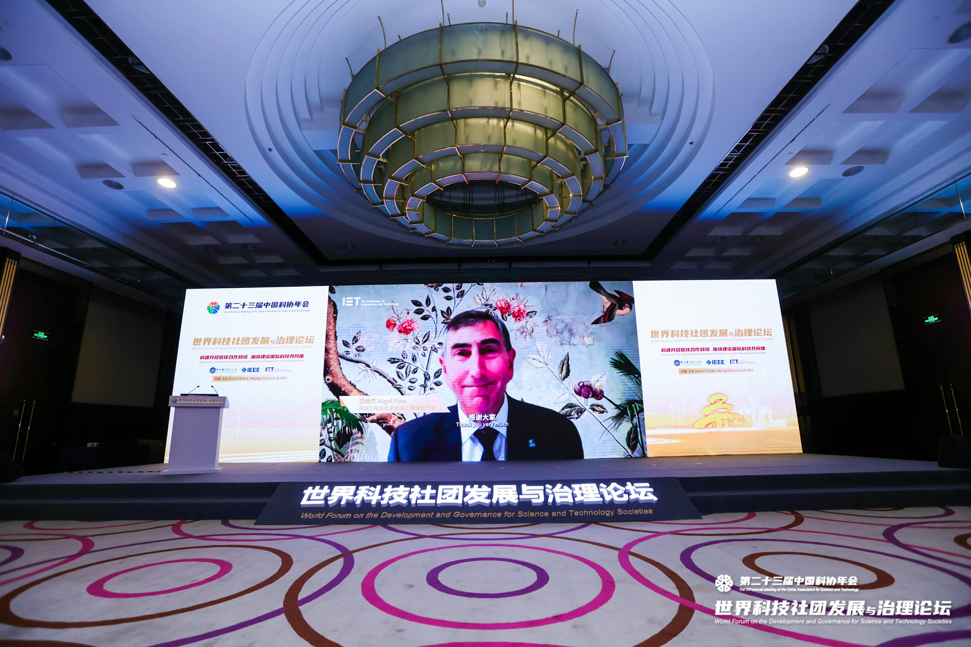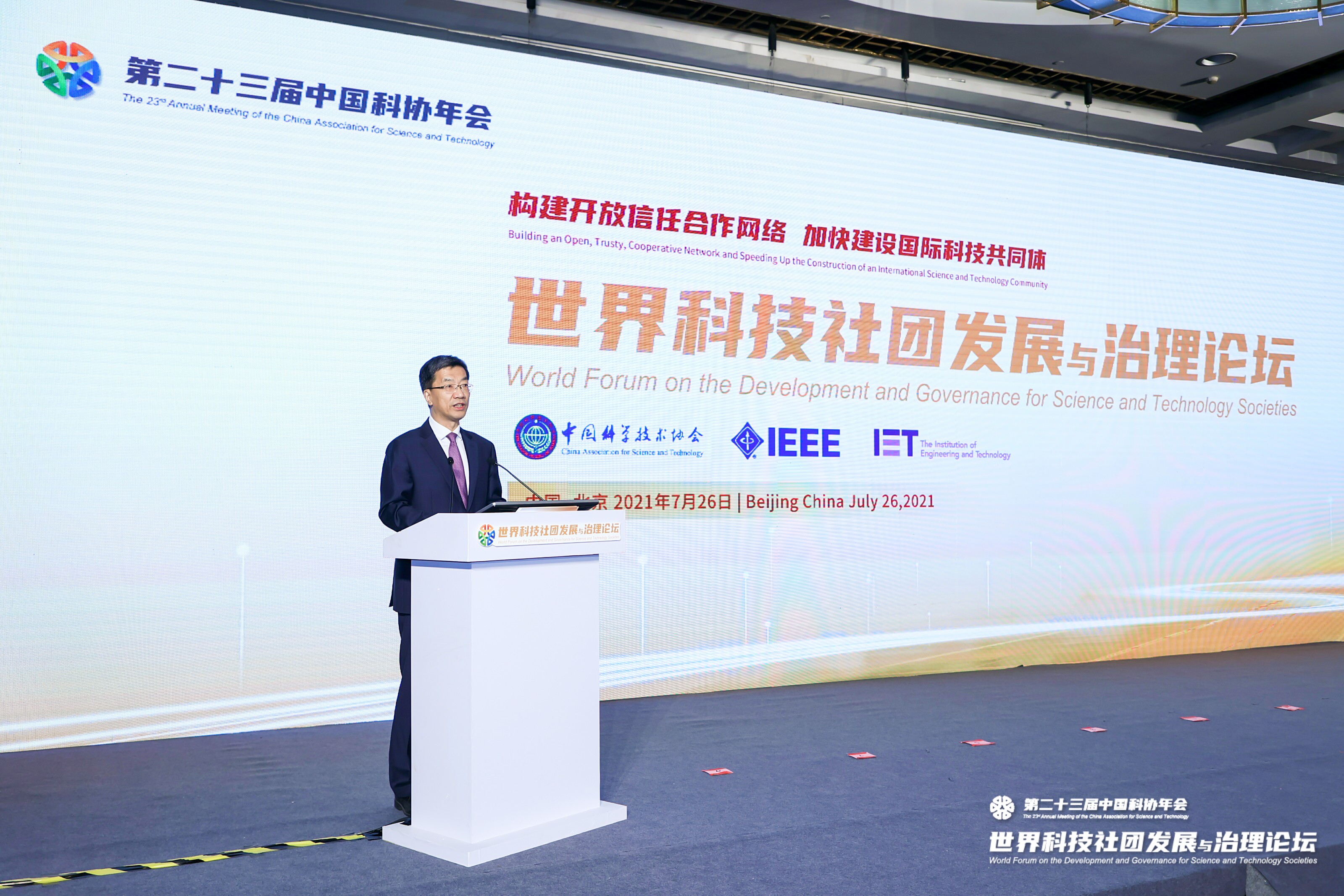 2021年7月26日,第二十三届中国科协年会世界科技社团发展与治理论坛在京举办。本次论坛由中国科学技术协会、美国电气与电子工程师协会(IEEE)、英国工程技术学会(IET)共同主办,以“构建开放信任合作网络 加快建设国际科技共同体”为主题,围绕可持续发展与碳排放、国际科技奖励、国际科技治理、人类生命健康、人才成长与会员服务等议题开展主旨报告和高端对话研讨。中国科协党组书记、常务副主席、书记处第一书记怀进鹏,美国科学促进会(AAAS) 首席执行官苏迪普 . 帕里赫(Sudip Parikh)、英国工程技术学会首席执行官范纳杰(Nigel Fine)等出席论坛并致辞。