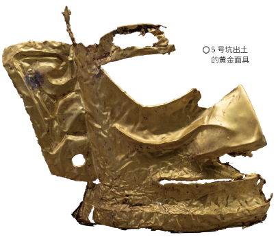 5号坑出土的黄金面具也极令人震撼。可惜的是,只剩残存的半张脸,残宽超过20厘米,重量超过280克,是三星堆遗址迄今发现的最大的黄金面具。面具厚度比较厚,不需要任何支撑,就可以独自立起来。它的面部特征与之前2号坑所见的一些铜面具基本一致,考古人员推测,它很可能是附着在其他材质人头像之上,用以给“脸上贴金”的。