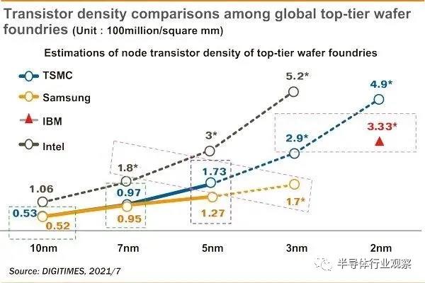 近期,Digitimes发表了一份研究报告,分析了三星、台积电、英特尔和IBM四家的半导体制程工艺密度,对比了10nm、7nm、5nm、3nm及2nm的具体情况。