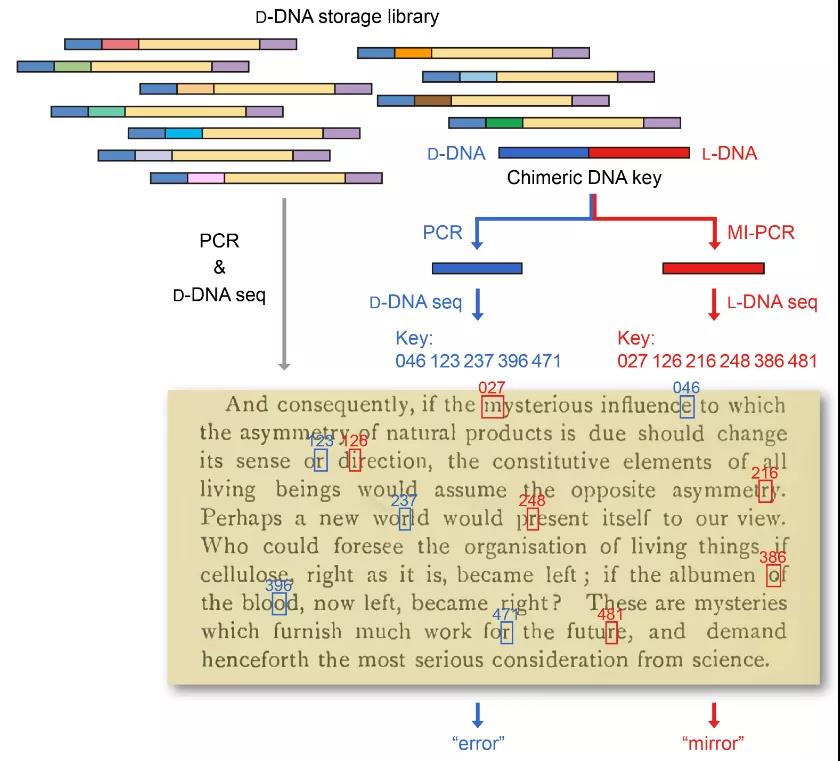此外,研究者还进一步开发了基于镜像DNA的信息隐写技术:将加密信息的密钥写入镜像DNA并混入天然DNA文库,使用天然DNA扩增与测序技术仅能读取天然DNA中的错误密钥,导致解码错误信息;只有使用镜像DNA扩增与测序技术才能读取镜像DNA中的正确密钥并解码加密信息(图4)。基于镜像DNA的信息隐写技术可以有效提高DNA所携带信息的保密性,为镜像生物学系统在信息安全领域的应用提供了新的思路。
