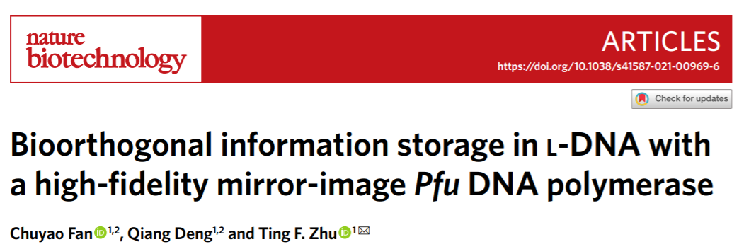 2021年7月29日,清华大学生命学院朱听课题组在Nature Biotechnology杂志上发表了文章Bioorthogonal information storage in L-DNA with a high-fidelity mirror-image Pfu DNA polymerase(利用高保真镜像Pfu DNA聚合酶实现生物正交的镜像DNA信息存储),通过近五年的研究探索,全化学合成了分子量达90 kDa的大型镜像蛋白质:镜像Pfu DNA聚合酶,利用该高保真镜像聚合酶组装出千碱基长度的长链镜像DNA,并开发了基于镜像DNA的信息存储技术。
