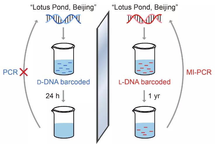 研究者还利用环境水样进行了生物正交性实验,结果表明携带采样地点信息的镜像DNA在从清华园荷塘采集的水样中存放一年后仍能被有效扩增,且其携带的信息仍能被准确读取;而同样存放条件下的天然DNA则在一天后即被完全降解,造成信息丢失(图3)。该实验展示了镜像DNA在复杂自然环境中长时间储存信息的能力及广泛的适用性。