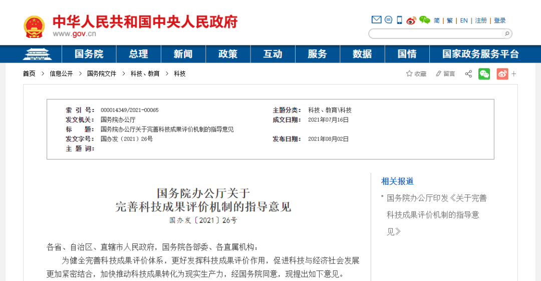 8月2日,国办发布《关于完善科技成果评价机制的指导意见》(以下简称《指导意见》)。直面科技成果转化痛点,文件提出了健全完善科技成果分类评价体系,坚决破解科技成果评价中的“唯论文、唯职称、唯学历、唯奖项”问题,完善科技成果评价激励和免责机制等十条硬核举措。